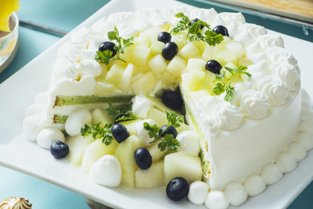 メロンスポンジにメロンをサンドし、更にメロンをたっぷり上に飾った、まさにメロンづくしの贅沢なショートケーキ。夏のメロンのみずみずしさと香りを存分にお楽しみください。