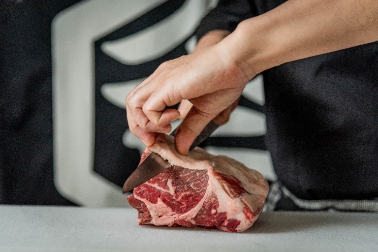 当社では、「安心・安全で高品質の国産牛」を塊肉にて仕入れておりますが、技術を習得した「肉職人」が仕込みを行うことにより、お肉の旨味を最大限に引き出しています。肉質にとことんこだわり抜いたお肉は、食べ放題とは思えないほどの品質であり、細かなスジや余分な脂を取り除く「手切り」により、柔らかくジューシーなお肉を提供しております。