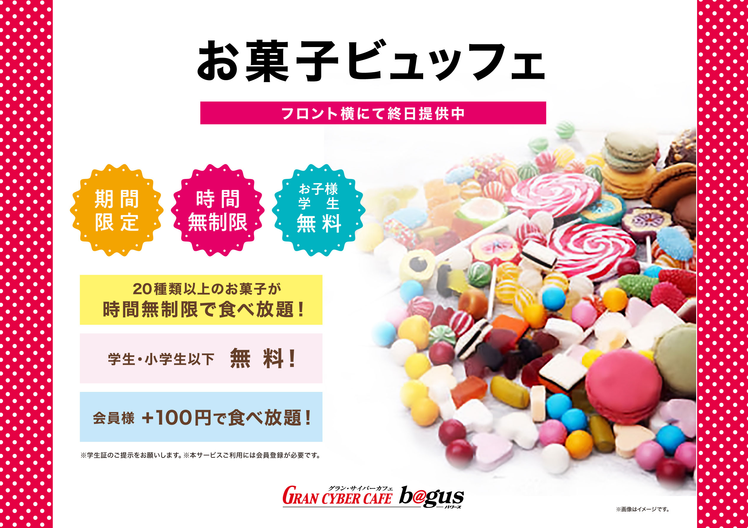 株式会社DDホールディングスの連結子会社である株式会社ダイヤモンドダイニングが運営するインターネットカフェ『グランサイバーカフェ バグース町田店』は、7月より夏休みに入った学生に向けて20種以上のお菓子が時間無制限で食べ放題になる「お菓子ビュッフェ」をスタートいたしました。学生・小学生以下は無料でお菓子が食べ放題の他、8月末まで「ペア学割」も実施しております。