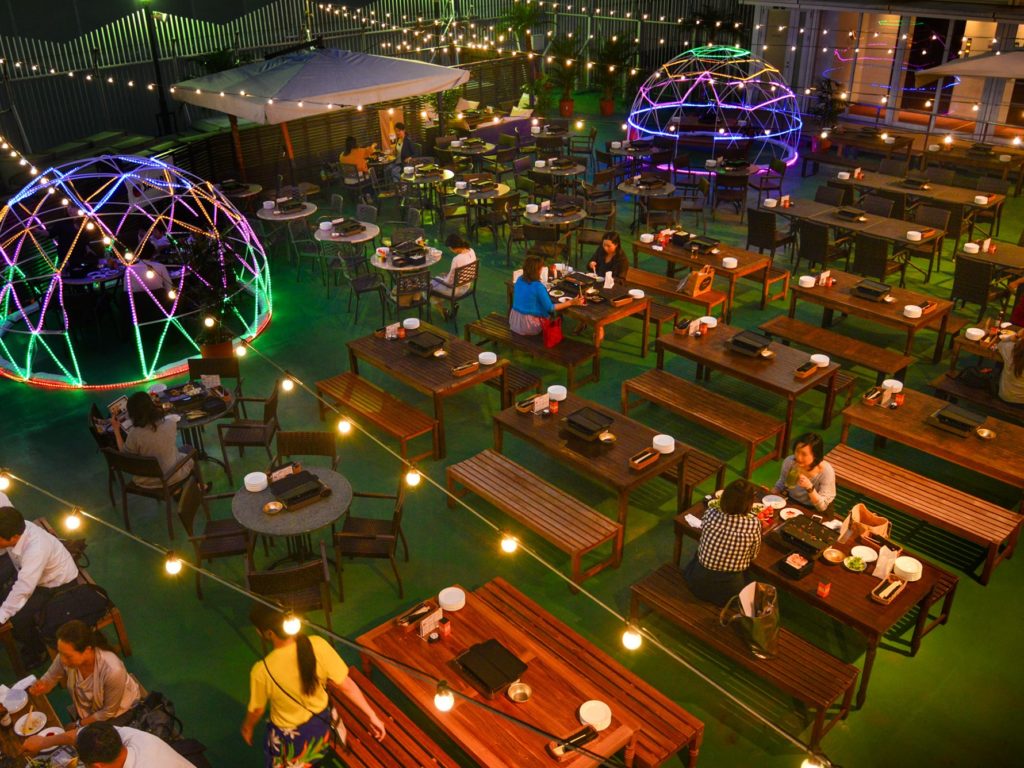 横浜駅西口より徒歩1分、横浜モアーズ最上階にある「横浜モアーズ食べ放題BBQビアガーデン」は、2021年7月1日(木)より営業を再開。晴れた日は開放的な屋外、雨天時はアジアンマーケットのような幻想的な屋内空間で手ぶらBBQが楽しめる全天候型のビアガーデン。ショッピングの帰りや、家族との食事、よく会う仲間との会食にピッタリです。