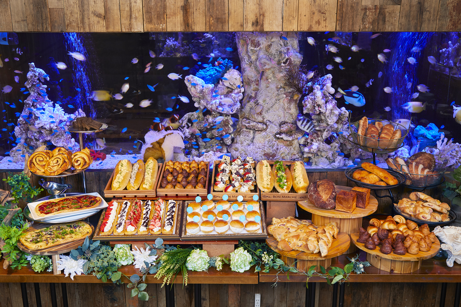今回は今、話題の「生クリーム専門店 ミルクのミルクマリトッツォ」も食べ放題。涼しげな店内で時間を気にせず、アクアリウムと美味しいランチで心も身体も癒やせます。