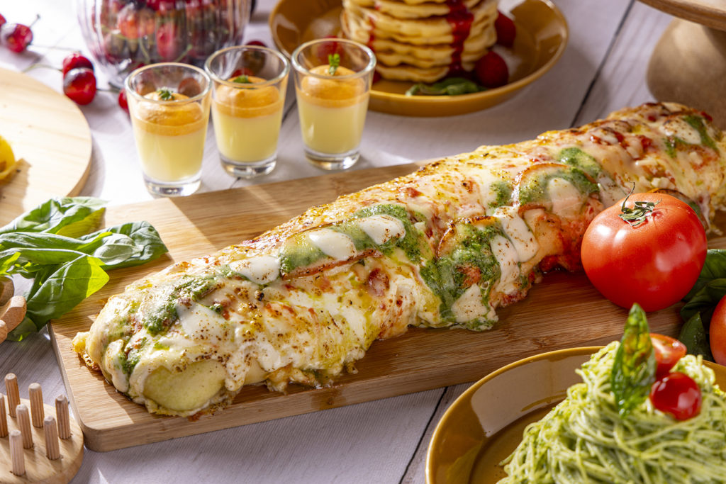 今回の目玉は、なんといっても新感覚の「ローリングピッツァ」! 全長40cmものピザ生地に、3種類のソース(トマト、バジル、ミート)と数種類のチーズを巻き込んで香ばしく焼き上げた、とってもユニークな一品なんです。「生地、ソース、チーズの三位一体の美味しさ」をぜひ味わってみてくださいね。しかも、ランチタイムにはシェフが目の前でダイナミックにカットしてくれるそう。断面からあふれ出るチーズは、もうたまらないでしょう!