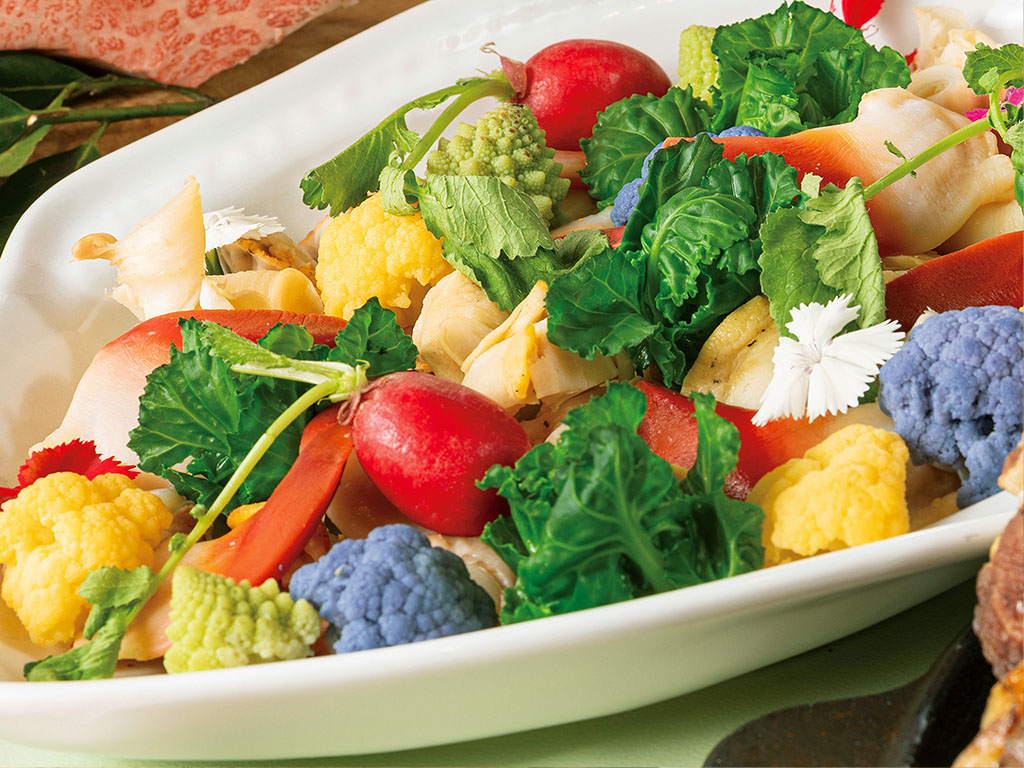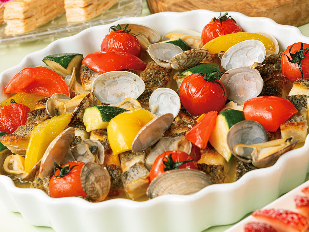 サーロインステーキの他にも、豊富なメニューがビュッフェスタイルで用意されています。冷製料理からは「取り合わせ貝類と春野菜のレモンマリネ」や「菜の花とベーコンのキッシュ」、温野菜からは「春の緑野菜ソテー」などが並びます。さらに、温製料理として「ガーリックライス」や「スズキとアサリの漁師風 サフランナージュ」、季節感を取り入れた「菜の花とベーコンのトマトスパゲッティー」なども提供されます。食後のデザートにはフルーツやスイーツ、焼き菓子なども充実しています。