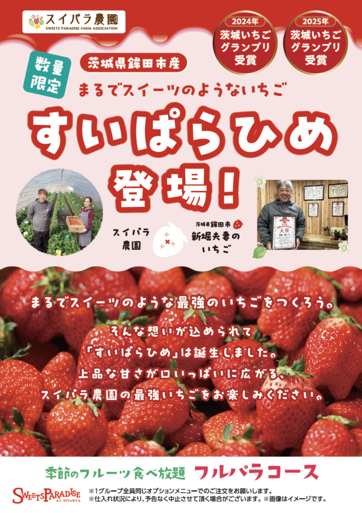 このキャンペーンでは、フルパラコースで提供中のブランドいちご食べ放題に加え、スイーツパラダイスが開発したオリジナルいちご品種「すいぱらひめ」の苗を鉢ごとお席に提供し、店内でいちご狩り体験ができます。体験後は、鉢をそのまま自宅に持ち帰り、育てながら「すいぱらひめ」を収穫して味わうことが可能です。