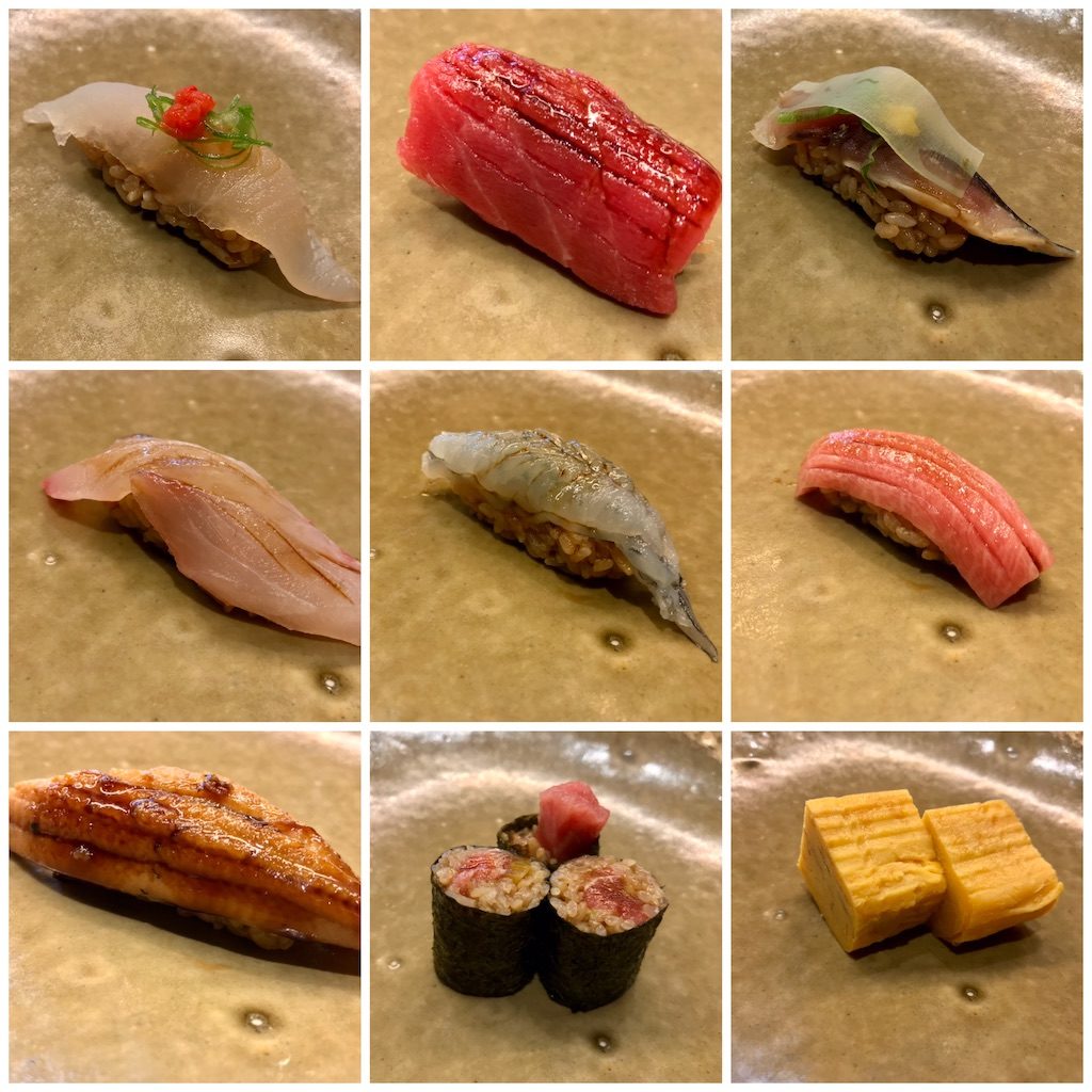 (握り)熊本産生本まぐろとろ・熊本産生本まぐろ赤身・極上生雲丹・特上ふんわり穴子・北海道産大粒いくら・あわび・赤貝・帆立・赤海老・〆サバ・数の子・玉子焼・おしんこ など