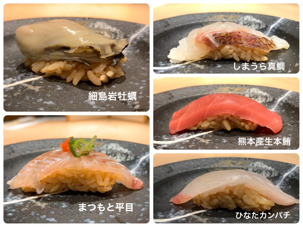 (宮崎県産ブランド鮮魚握り)まつもと平目・しまうら真鯛・奥日向サーモン・・細島岩牡蠣・細島檜扇貝・ひなたカンパチ