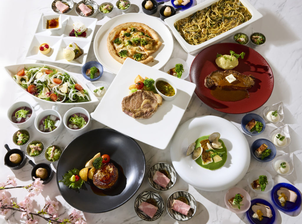 さらに、コーススタイルで提供されるメイン料理は、肉厚な東京ブランドポーク「TOKYO X」のソテーやビーフサーロインステーキ、鯛と蛤の白ワイン蒸しなど4種類から1品を選べます。また、桜クレームブリュレを含むパティシエ自慢のデザート4種盛合せも楽しめます。平日は食べ放題のデザートも2種類提供されます。