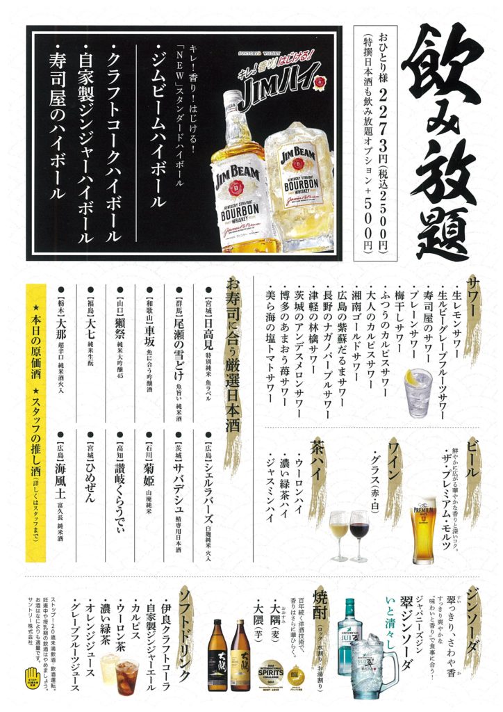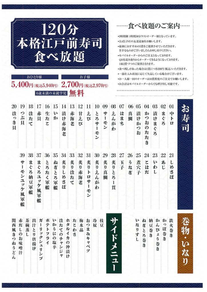 株式会社ハイルは、海鮮居酒屋 涛司(とうじ)大船本店にて、120分本格寿司食べ放題を3月15日(日)までの期間限定で実施しています。