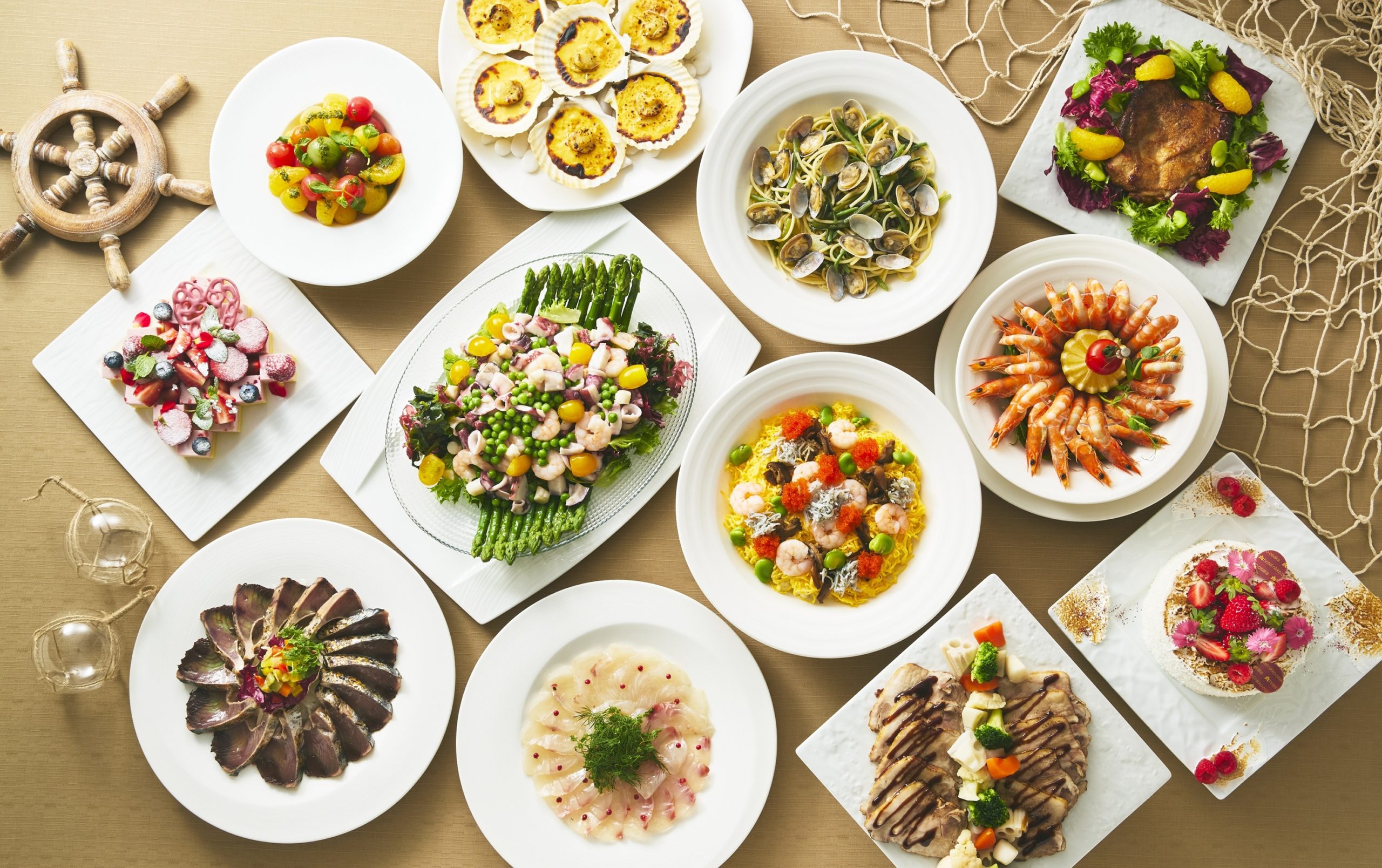ブッフェコーナーには「春の彩りシーフードサラダ」や「海の幸ちらし寿司」など、旬の食材を生かしたメニューが並びます。デザートには「苺バニラタルト」といった季節のフルーツを使用したスイーツも提供します。