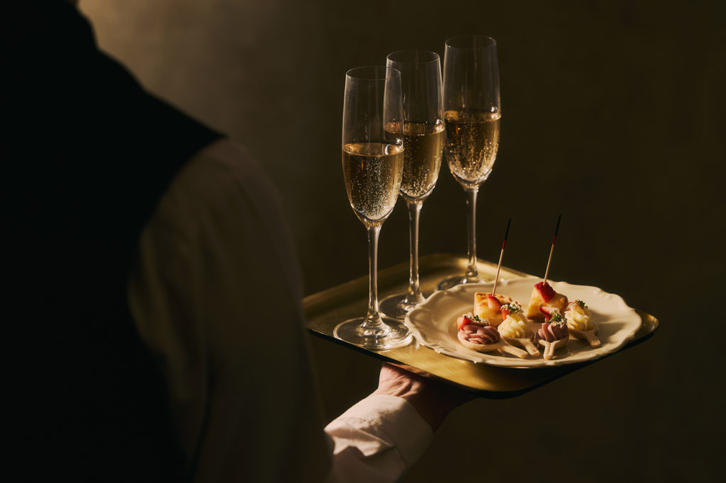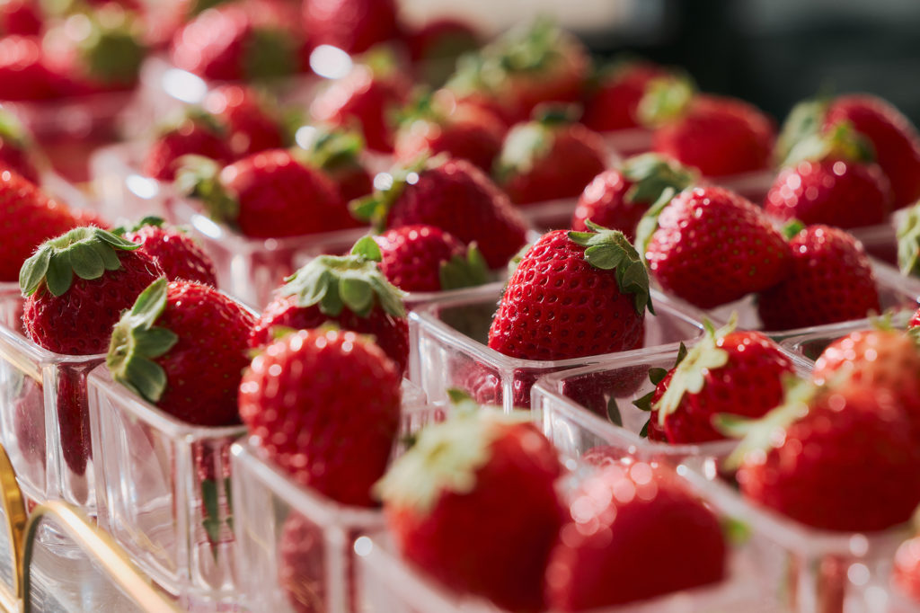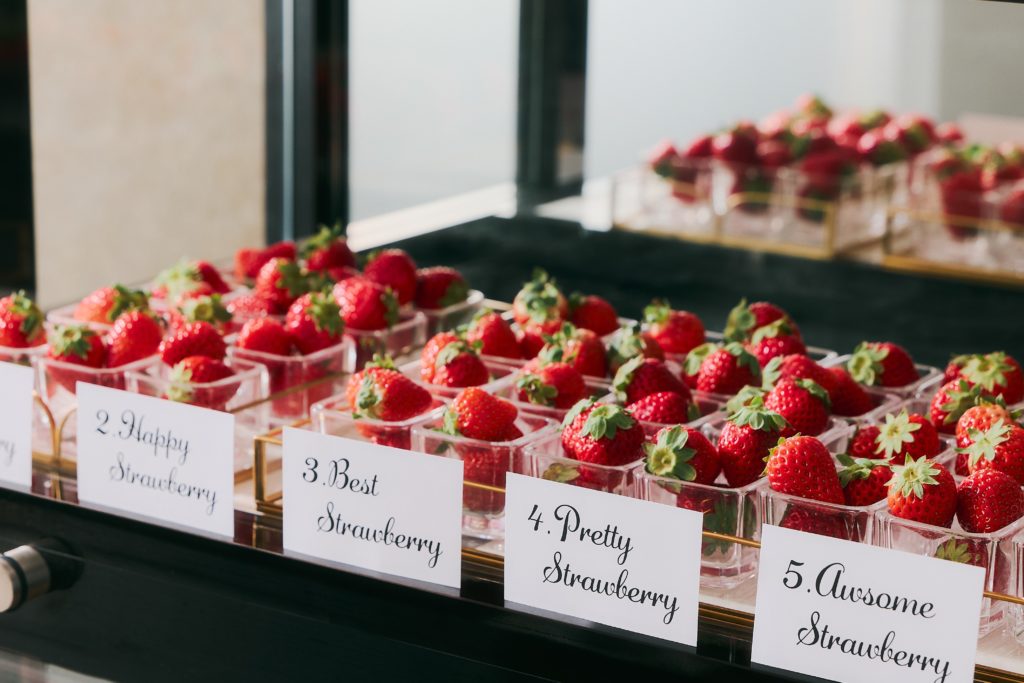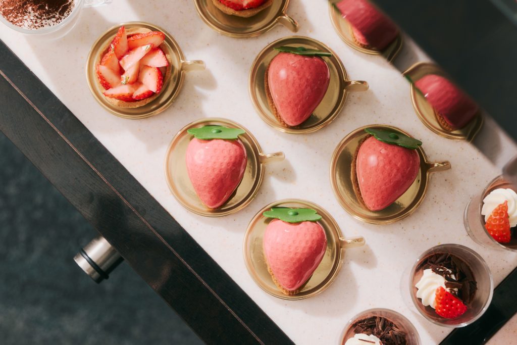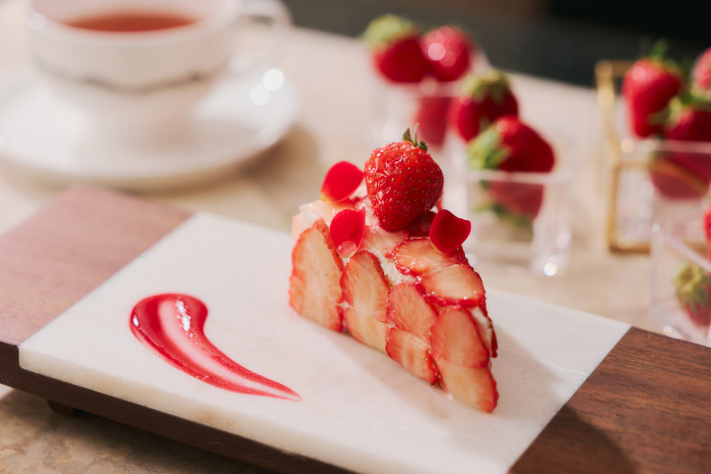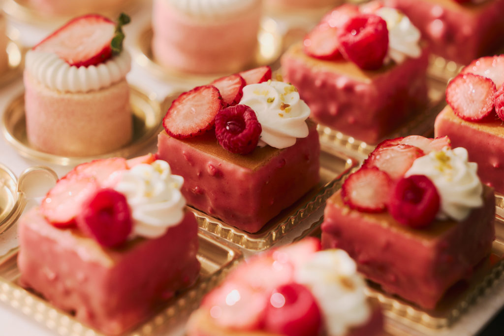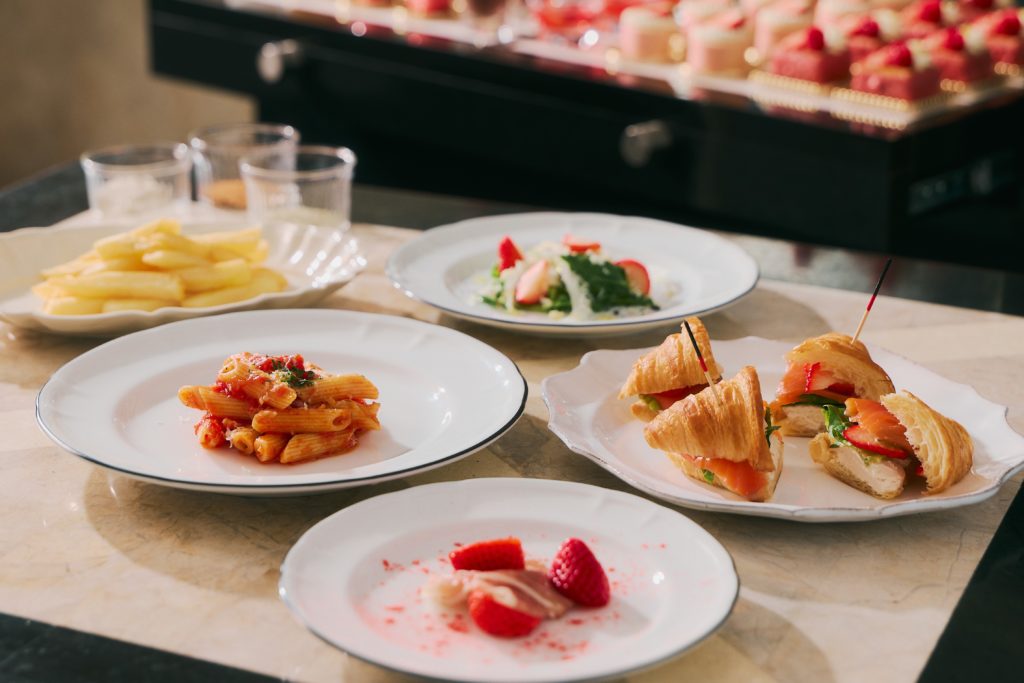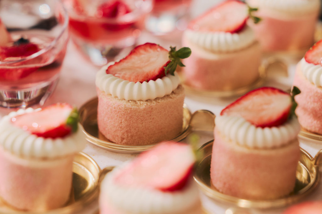 ビュッフェは、ホテルロビーでのウェルカムパーティーからスタートし、ウェルカムドリンクとフィンガーフードが提供されます。その後「La Jyho Terrace」にて、ウェルカムデセール「こだわりいちごショート」をご用意。5種のブランドいちごをはじめ、ホテルメイドの華やかないちごスイーツ、さらにサラダやスープ、パスタなどのセイボリーも充実しており、ドリンクも席でオーダー可能です。