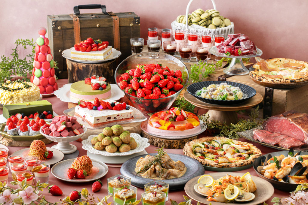 本ブッフェでは、旬のフレッシュ苺の食べ放題に加え、苺を主役にしたパンナコッタやティラミスなどのスイーツ、さらに「生搾りいちごのモンブラン」といった“仕上げの演出”が楽しめるデザートも用意されます。本格イタリアンも充実しており、旬食材をふんだんに使用した約60種の料理がラインナップされます。各店舗では、それぞれの特色を活かしたシーズナルメニューも提供されます。