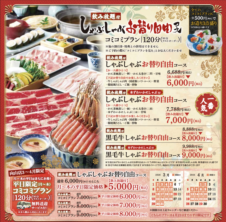 今回提供されるのは、飲み放題付きの「しゃぶしゃぶお替り自由コース」4種類と、「季節しゃぶ飲み放題付 得々プラン」です。「しゃぶしゃぶお替り自由コース」は120分制(90分ラストオーダー)で、牛肉や国産豚、野菜などの食べ放題に、かに茶碗蒸しや太巻きなどが付きます。価格は向山店が6,000円から9,000円(税込)、南越谷店が6,800円から9,800円(税込)で、店舗ごとに異なる追加オプションも用意されています。向山店では特定期間の月〜木曜日に特別価格での提供もあります。