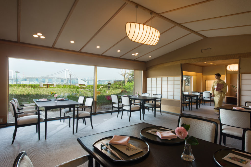 数寄屋造りの落ち着いた空間からは、日本庭園越しに広がる東京湾の景色を望むことができ、旬のいちごをふんだんに使用したスイーツや日本料理店ならではの和の甘味をご堪能いただけます。ビュッフェ台には、「いちごショートケーキ」や「いちごタルト」などの定番に加え、フレッシュいちご2種の食べ比べも提供されます。いちごソースが爽やかな「あんみつ」や、とろける食感の「わらび餅」など、和の要素を取り入れたデザートも並びます。