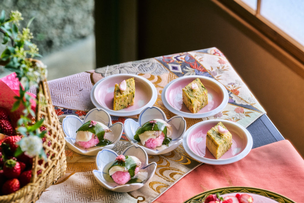 また、スイーツの合間に楽しめるセイボリーとして、桜海老と生海苔の風味が広がる「厚焼き玉子」と、桜の葉が香る「真鯛の道明寺蒸し」の2品が用意されています。お飲み物にはコーヒー、紅茶、日本茶、ほうじ茶が提供されます(抹茶は追加料金)。