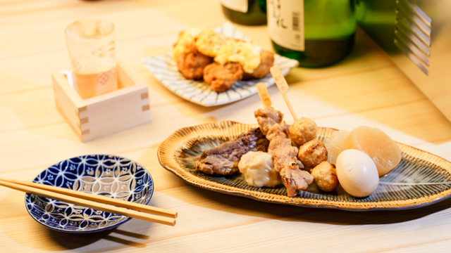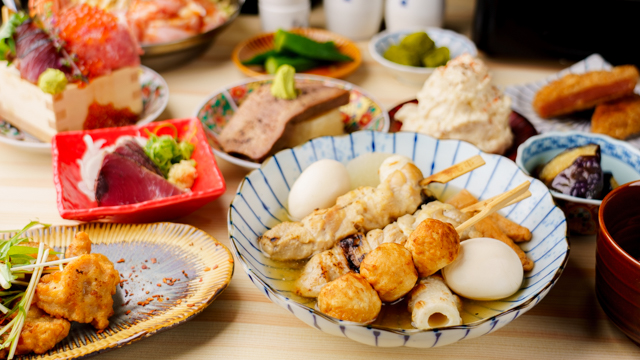 名物である濃厚豚骨おでんは、豚骨と鶏白湯を合わせた出汁が特徴で、箸でほどけるほど柔らかい「厚切りタンおでん」が看板メニューです。〆には豚骨ラーメンも用意されています。海鮮メニューでは、いくらと鮮魚が盛り付けられた「いくらの海鮮升盛り」が目を引き、刺身以外にも味付けに工夫を凝らした逸品を提供いたします。