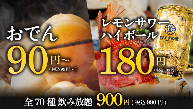 全130品が対象となる食べ飲み放題は、名物の厚切りタンおでんや海鮮升盛りなどを含み、税込3,300円で提供されます。また、単品利用も可能で、ハイボールは198円、おでんは99円からと、常時手頃な価格で提供されます。食べ飲み放題プランでは、お通しやチャージ料金は一切不要です。