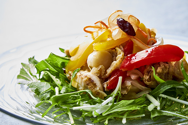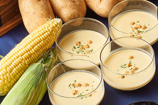 北海道産の帆立貝を使ったエスカベッシュはほどよい酸味でさわやかな味わいに。北海道産トウモロコシの甘みを生かし濃厚に仕上げたコーンクリームスープもぜひご賞味ください。タラをペースト状にし、じゃがいもと一緒に牛乳で煮込んだブランダード風はほっこりアツアツをお楽しみください。