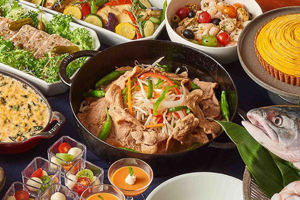 豚肩ロース肉のジンギスカン風やディナータイム限定でまぐろや炙りサーモンの握り寿司もお楽しみいただけます。北海道産生クリームを使用したテリーヌフロマージュはしっとりと濃厚な味わいに仕上げました。