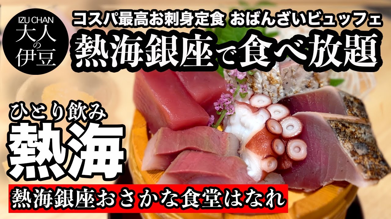 【熱海食べ放題・グルメ・海鮮】大人気の熱海銀座おさかな食堂はなれ・コスパ最高の定食はおばんざいビュッフェ!分厚い刺身定食と静岡麦酒で大満足!ひとり飲み・食べ歩き・熱海旅行・熱海ランチ・熱海朝ごはん