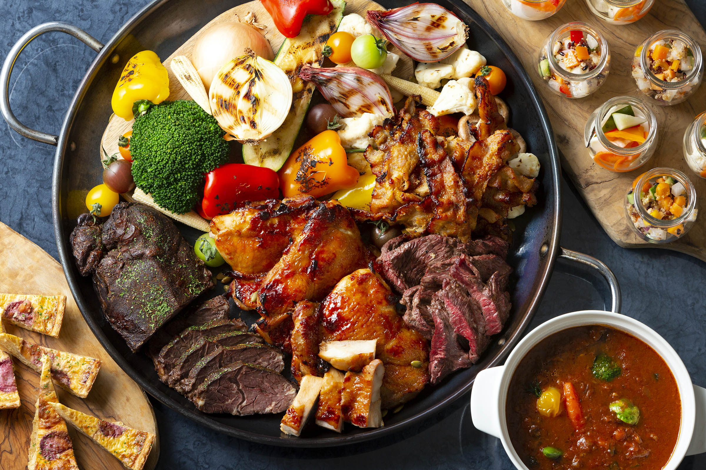 夏の訪れを告げるビアテラスには、焼きたての肉料理が盛りだくさん!じっくりと煮込みこんがりと焼き目を付け甘辛い味わいに仕上げた「BBQビーフ」はビールにぴったりの一品、グレープフルーツに付け込み焼き上げた「照り焼きチキン」は暑い夏にもさっぱりとお召し上がりいただけます。その他にも月替わりのお料理やデザートなど約30種のフードメニューがビュッフェボードを彩ります。